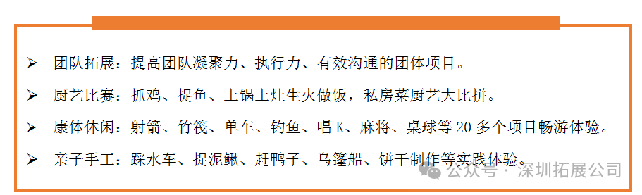 除康体休闲项目外,园区更是多种特色项目,以满足不同活动需要,如:下午茶、露营场地、会议住宿配套、时令蔬果采摘等,可与策划沟通定制行程。