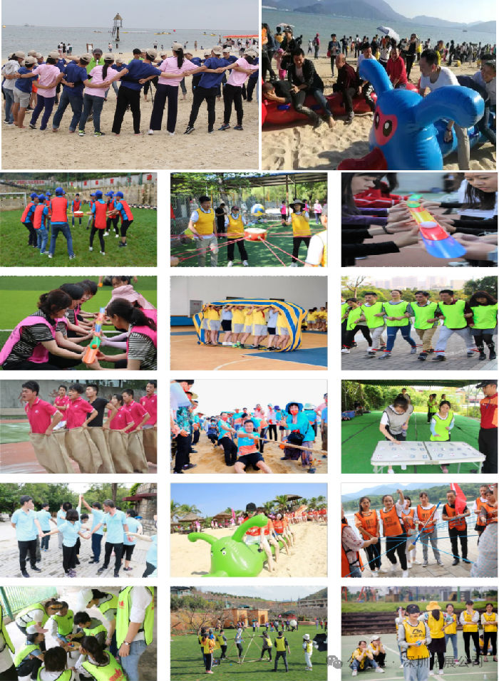 拓展趣味型(可选3项):击鼓颠球、无敌风火轮、达芬奇密码、珠行万里、南水北调、快乐袋鼠跳、激情99、驿站传书、不倒森林、盲人方阵、神笔马良、手忙脚乱、决战沙场、摸石过河、两人三足、蒙眼互打、拔河比赛、解手链、动力圈。