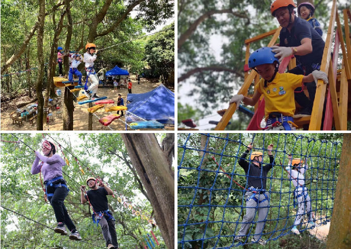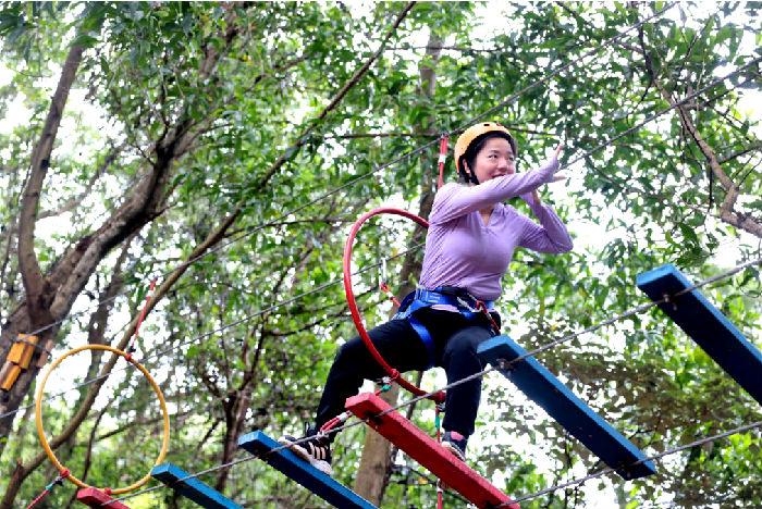 游玩【丛林穿越】,源自欧洲的冒险运动,通过在林间设置各种各样的关卡,让参与者感受森林攀登与林间穿梭,体验激情冒险的酣畅,呼吸充满负离子的空气,让心灵和身体都得到放松!一共有两条线路,在这里,大人小孩都能够找到自己的丛林乐趣